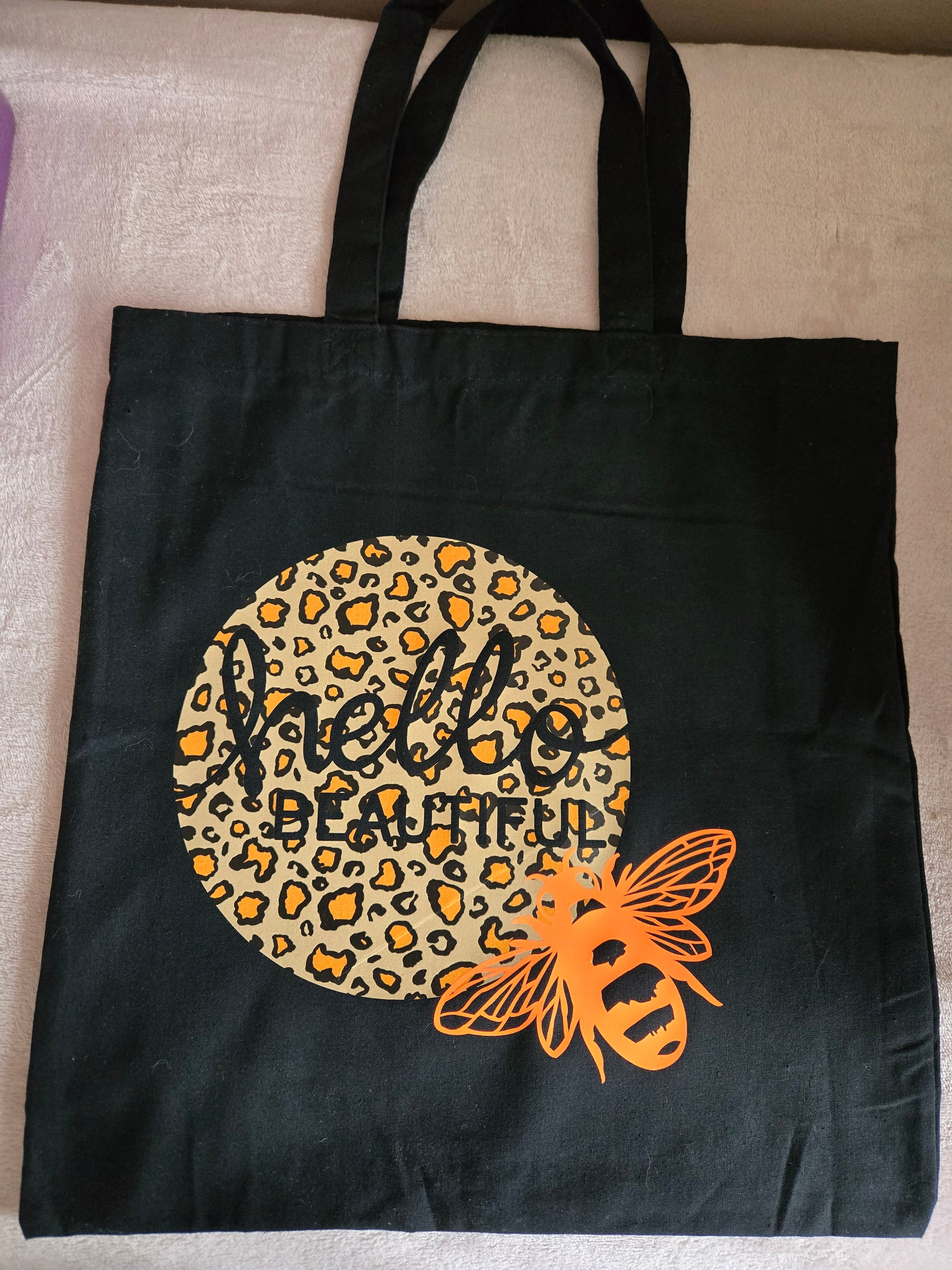 A Beautiful Animal Print With a Bee designed Tote Bag. Can be used to carry anything light weight, papers, snacks, medication, lunch, groceries. A stunning one of a kind piece.